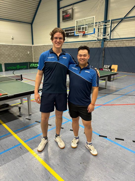 Unsere Erste schlug in der 2. Provinzklasse gegen Astrid in einer bislang einmaligen Spielerkonstellation auf. Unser Neuzugang Boris Zhao (B4) führte Eupen A gemeinsam mit seinem ehemaligen Kommilitonen und Mitbewohner Yves Sauter (C2), der am Samstag sein erstes Spiel in dieser Saison für den TTC bestritt, an. Yves konnte, trotz akutem Spielpraxismangel, seinen Gegner Ryan Wingel (C4) bei seiner ersten Partie des Abends äußerst knapp mit 13:11 im Entscheidungssatz bezwingen. Zur Pause standen wir 5:3 vorne. Die Gegner holten ihren Rückstand nach der Halbzeit jedoch wieder auf. Beim 7:7-Zwischenstand mussten Yves und Boris nochmal für die zwei letzten, entscheidenden Partien an die Platte. Boris machte, so wie schon bei den drei vorherigen Partien, auch bei seinem letzten Spiel kurzen Prozess mit seinem Gegner. Yves ging als Verlieren aus dem letzten Duell des Abends heraus. Das Endergebnis: 8:8. Boris blieb fehlerfrei, Michael Ürlings (C2) überzeugte erneut mit drei Punkten. Yves siegte einmal, Ben Olbertz (C4) ging leer aus. "Ein durch und durch spannende Partie mit sehenswerten Spielen. Wir können uns sehr glücklich über Boris' und Yves' Einsatz schätzen", so Rampelbergh.